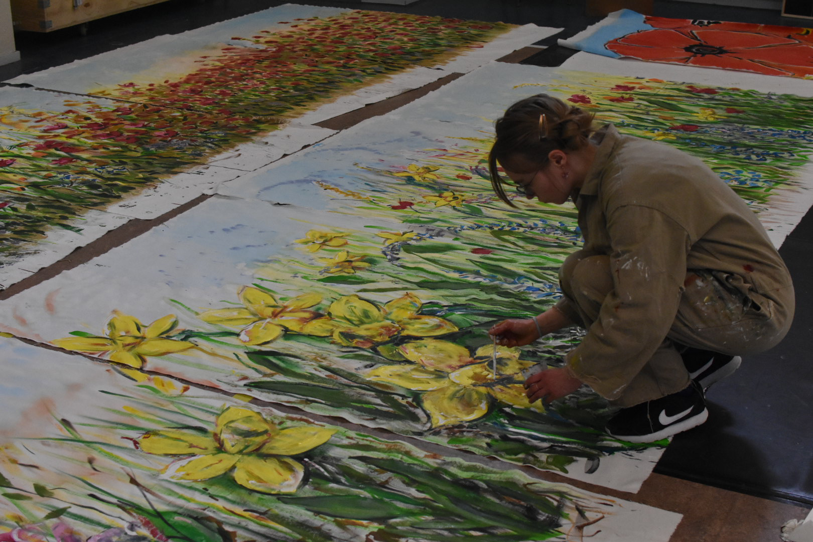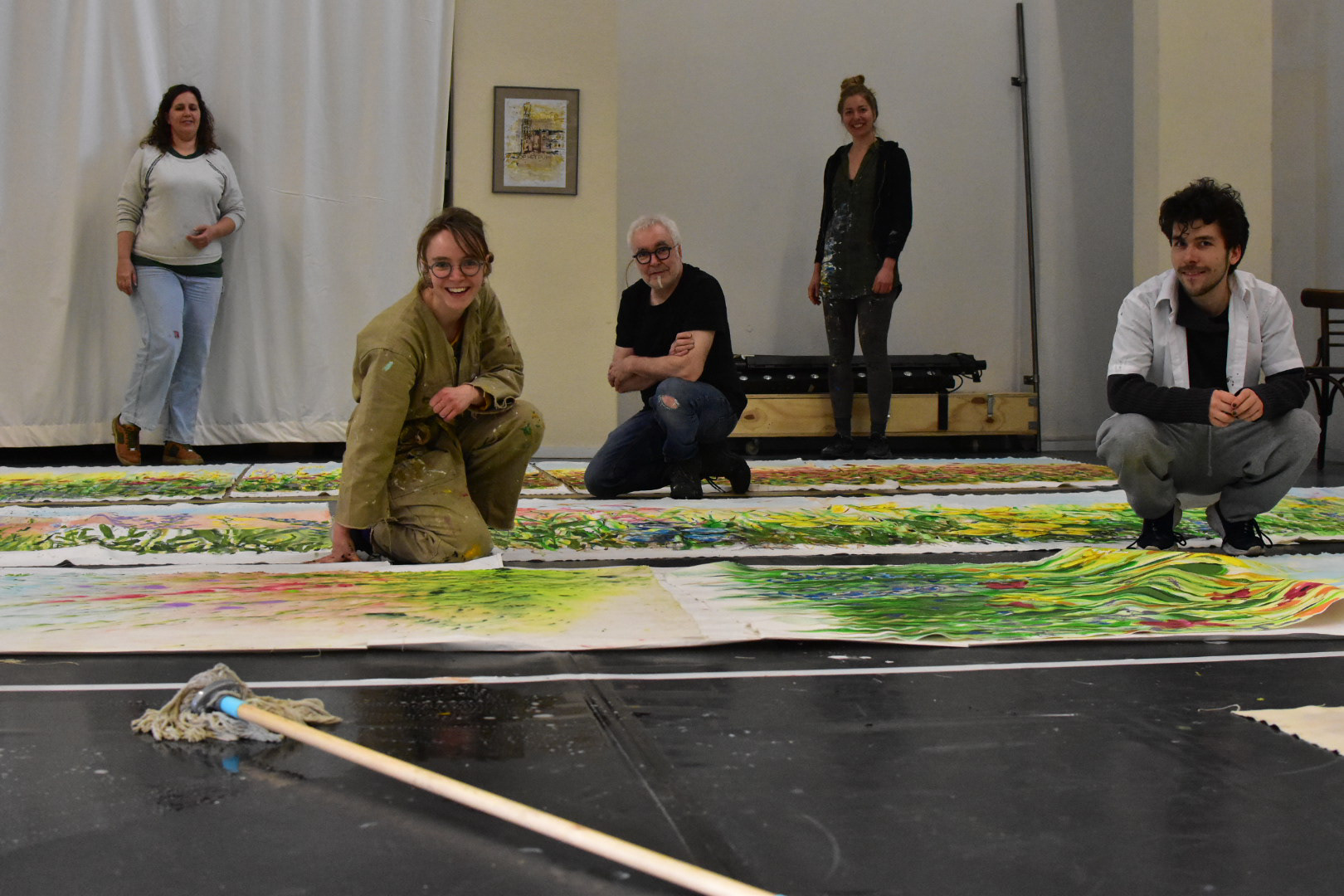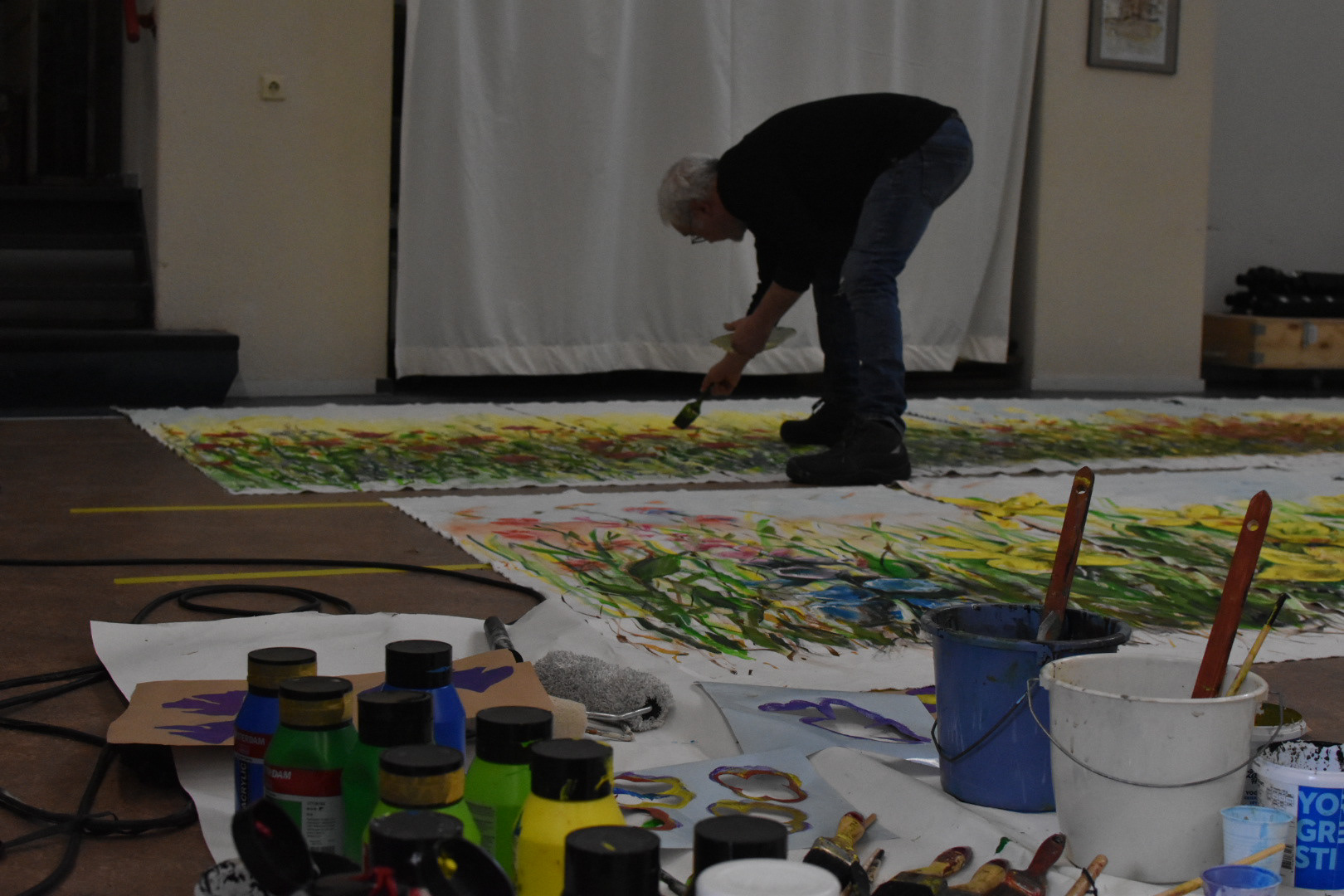 Hier zie je foto's van het portretten panorama (25 meter) en de bloemenzee (25 meter) van voorstelling ‘Op het Puin, en dan nu’.